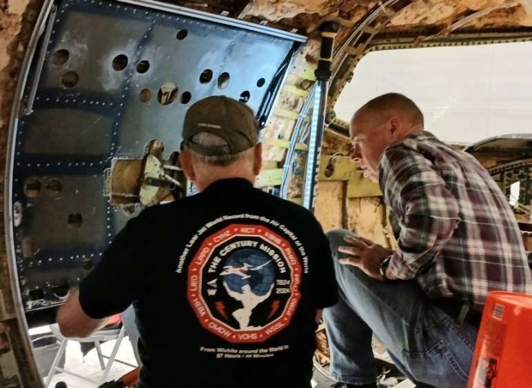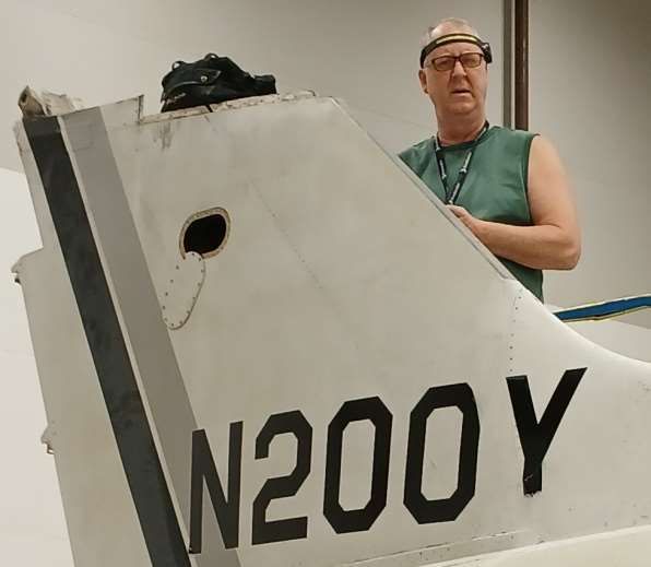 The final sealing of the fuselage, tip tanks and horizontal stabilizer has been completed and they were prepared to be shipped off to have their external paint removed. All openings, seams, windshield and windows had aluminum tape or sealer applied to keep the chemical stripper out of the inside. The tip tanks and horizontal stabilizer were loaded onto a trailer on August 5, 2025 and taken to a paint facility for paint stripping using Al Goodwin’s truck and a trailer borrowed by Dave Dendurant. The tip tank cradles were the same ones that were used for their trip from Florida. The fuselage was lifted off of its jacks and placed in its cradle on a trailer for its trip to have the paint stripped on August 12, 2025. The truck and trailer, as well as the trip to the paint facility, were donated by Patton Trucking of Clearwater, Kansas. These parts should be back in building 14 in early September and ready to have the remaining bits of paint removed. Then we will remove the windshields, windows, panels, finish the internal foam removal and start the Non-Destructive Inspection (NDI). Any issues found on the skins, stringers, etc., such as corrosion, will be repaired or replaced. While these parts are out to be stripped, we are currently setting up to do a pressure check of the right hand wing looking for any leaks. These results, along with the corrosion found on the left wing, will help us make a decision about the wing. Whether it is repairable or we must replace it. Cross your fingers! We just passed 1,400 volunteer hours since 23-003 arrived in Wichita! Thank you to all of you who have contributed your time to help restore 23-003!